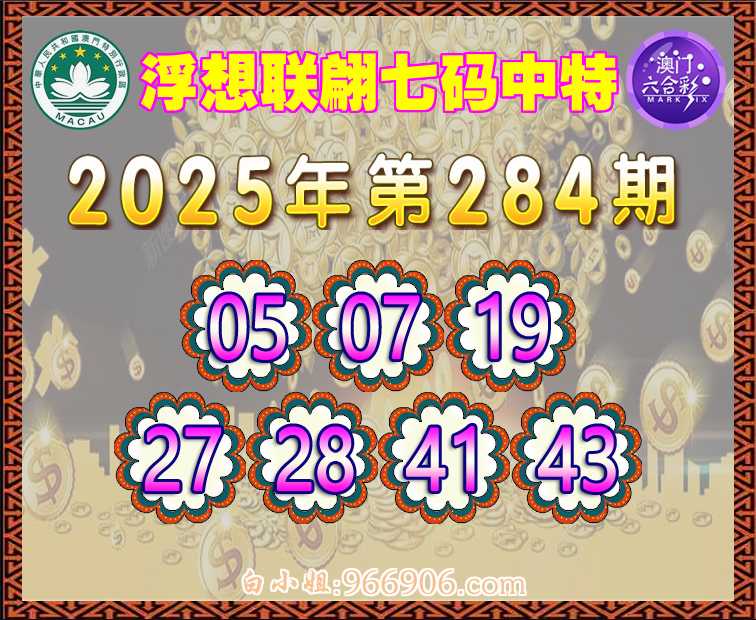 284期:【浮想联翩】 🩴七码中特🩴【05.07.19.27.28.41.43】开:41准